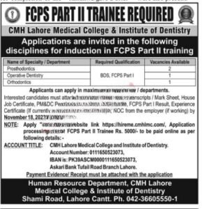Newest Combined Military Hospital jobs 2023 in Lahore has been made known by the most recent advertisement Applications for admission to FCPS Part II training are being accepted in the following fields from CMH Lahore Medical College & Institute of Dentistry .Every job detail is mentioned here. After completing the hiring process, both male and female candidates may apply for these Latest Govt Jobs in Punjab.