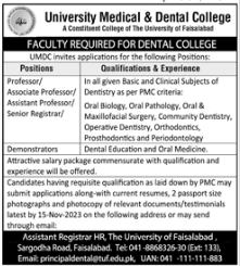 Newest University Medical and Dental College Jobs 2023 in Faisalabad has been made known by the most recent advertisement In accordance with university policies, UMDC is accepting applications for the following positions: non-teaching staff (senior registrar and demonstrators) and teaching staff (professor, associate professor, and assistant professor).Both male and female candidates may apply for these Latest Government Jobs in Punjab and, upon successful completion of the hiring process, be eligible to work in Pakistan.