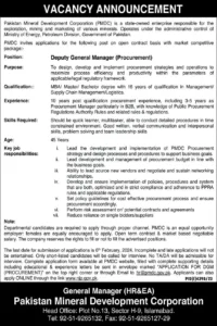 Pakistan Mineral Development Corporation (PMDC) is currently looking for experienced, skilled, well-disciplined, and highly educated professionals. This job is a Contract base. Eligible candidates can apply for the following positions Deputy General Manager (Procurement). Candidates apply for these posts before the last date 06th February 2024.